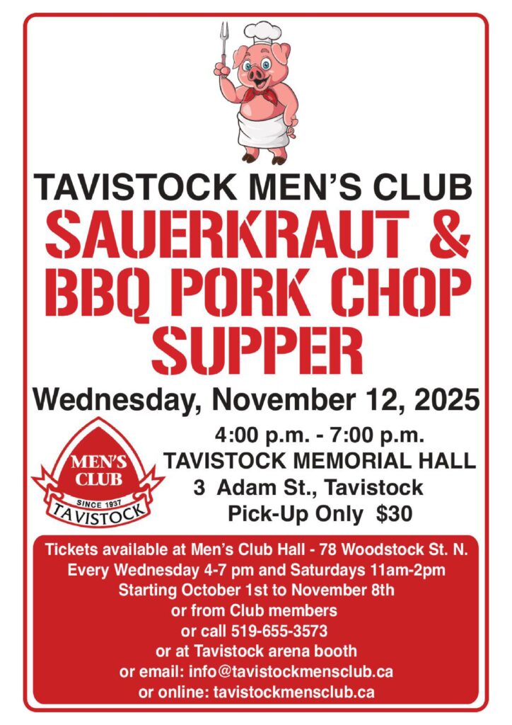Wednesday, November 12, 20254:00 - 7:00 pm @ Tavistock Memorial Hall3 Adam Street, TavistockPick Up Only$30Tickets available at Men's Club Hall78 Woodstock St. N.Every Wednesday 4-7pm and Saturdays 11am-2pmStarting October 1st to November 8th or from Club members - or call 519-655-3573 - or at the Tavistock Arena Booth.Email: [email protected]